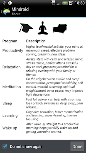 You are kindly welcome to use Mindroid for FREE if you are fine with the default setting. To take advantage of all the available programs and to mix them with the different environments, please consider purchasing the Mindroid Unlock for a minimal Play Store price. We will very much appreciate your contribution and use it for further improvements of this app. Please install the Unlock on top of the current installation (do not uninstall Mindroid).